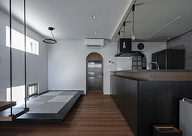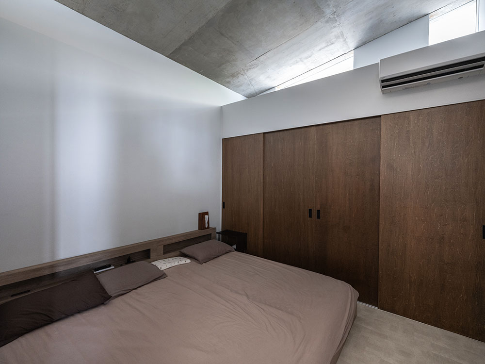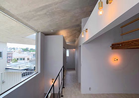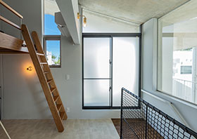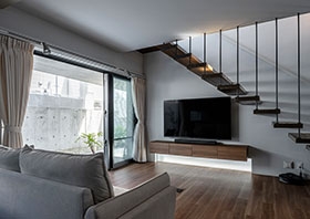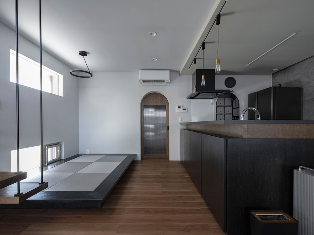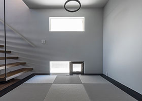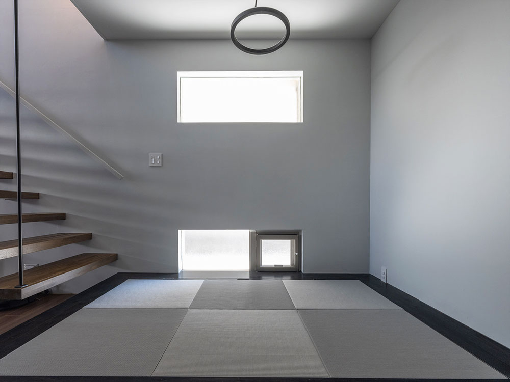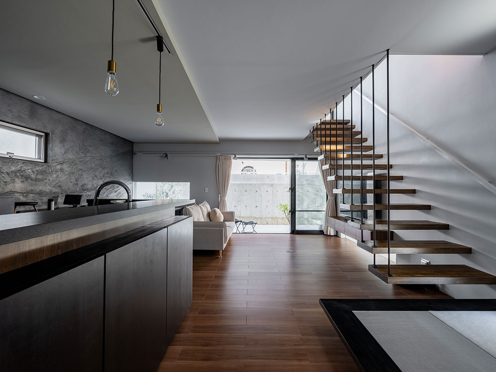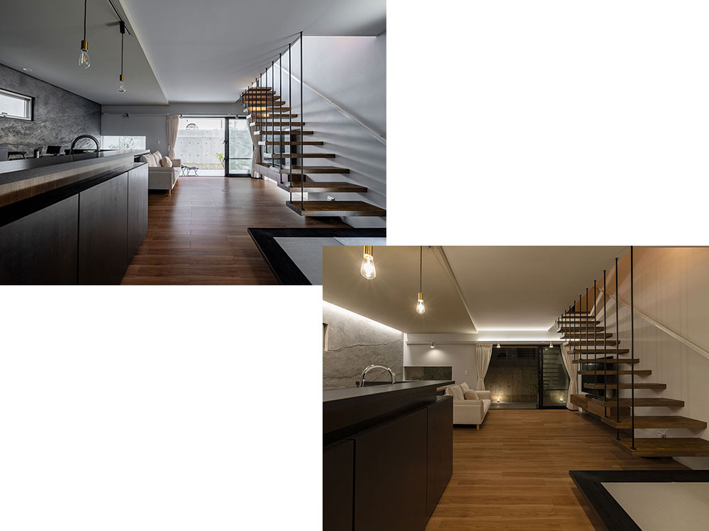 閉じた外観とは対照的に、内部は窓や吹き抜け階段からやわらかな光と風が巡る開放的な空間です。時間と共に変わる自然光が家の中に豊かな表情を生み出します。