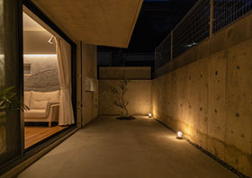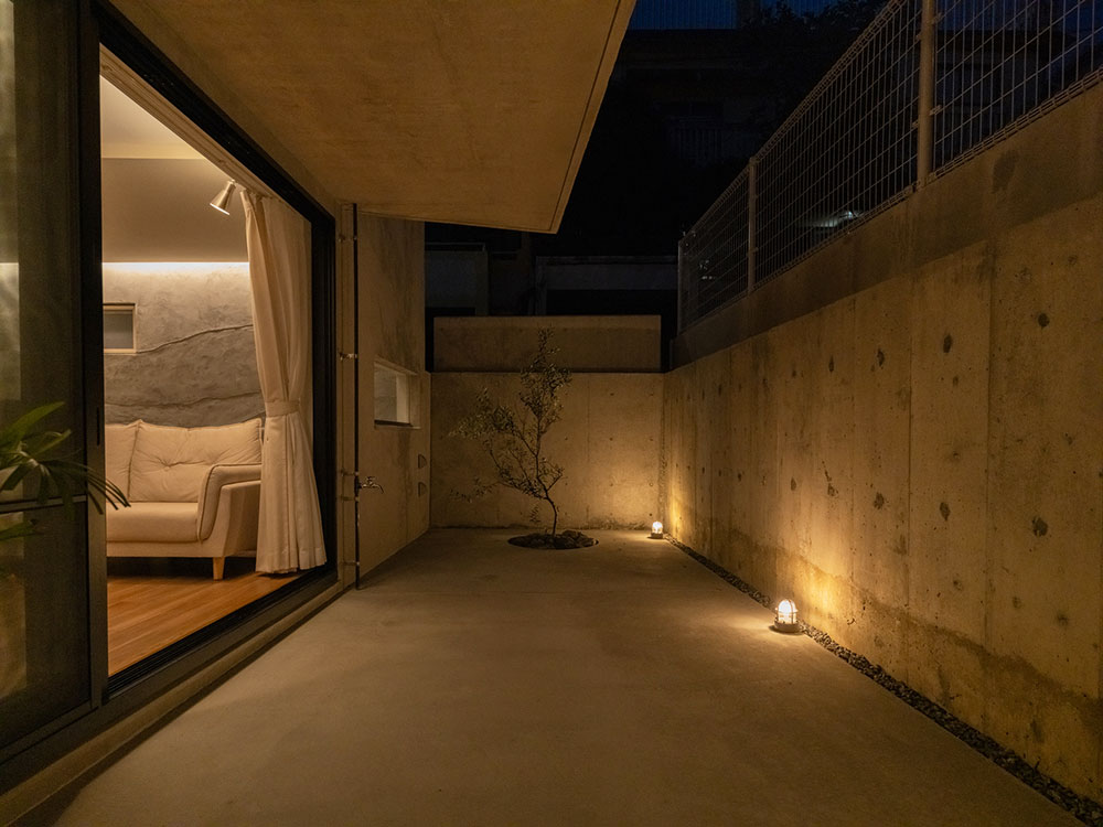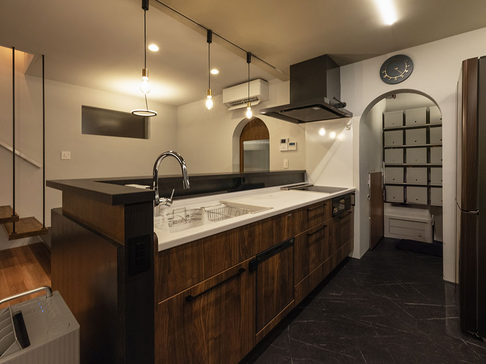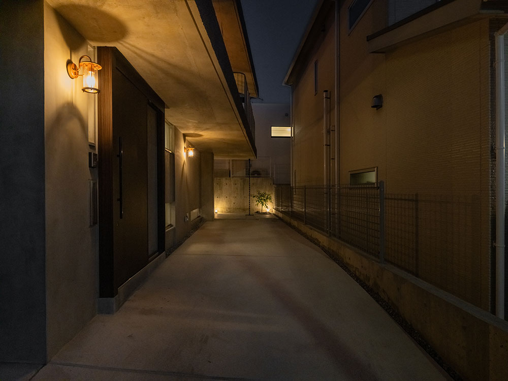 夜の照明は、明るすぎず、落ち着いた雰囲気を大切に設計しています。写真では全ての照明を点けていますが、明るさを落として過ごすのもおすすめです。共働き世帯が増える今、夜の住まいで過ごす時間が暮らしの中心になりつつあり、照明もまた、自然光と同じくらい暮らしの質を左右する大切な要素と考えています。